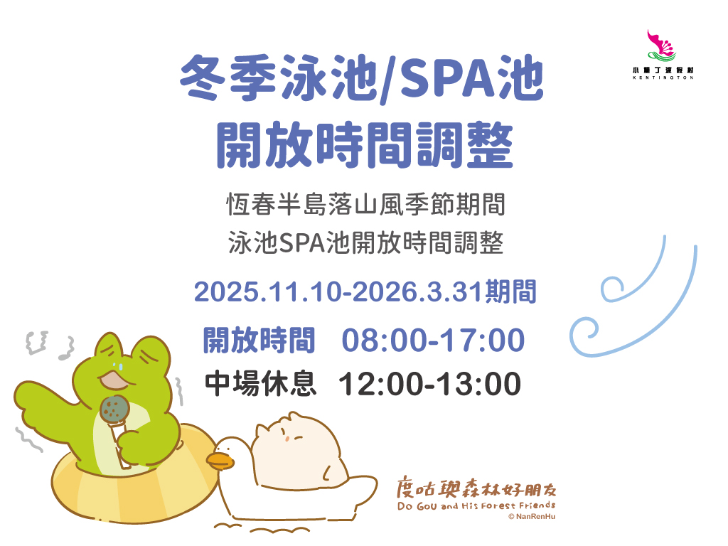 恆春半島落山風季節期間,泳池與SPA池開放時間調整如下
