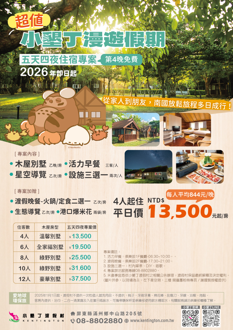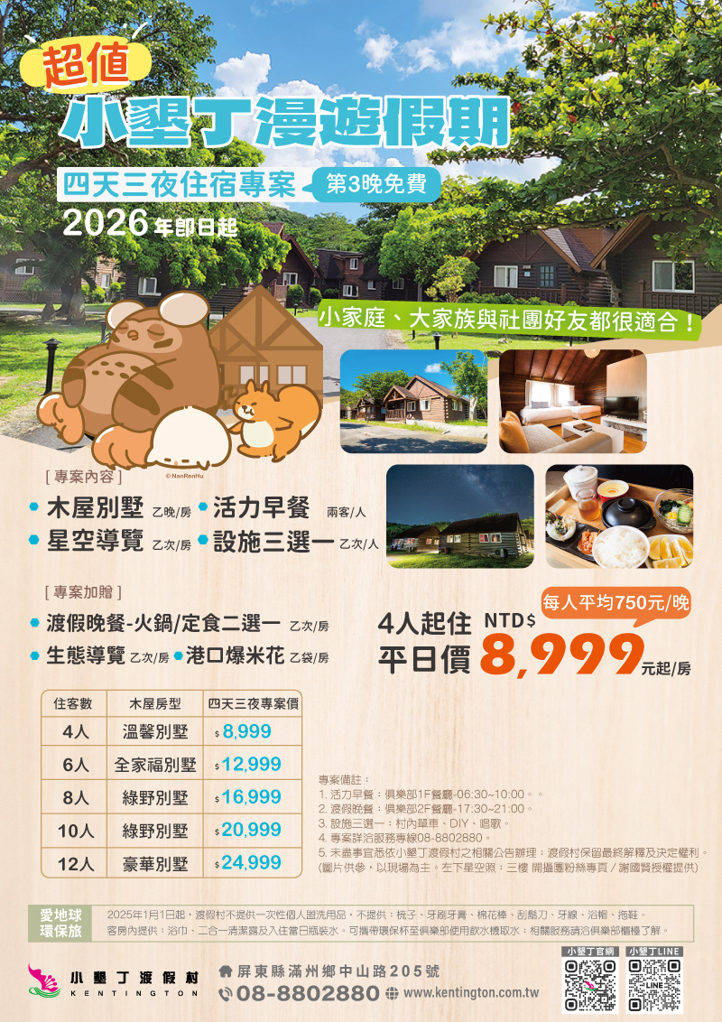 超值小墾丁漫遊假期|四天三夜住宿專案 第三晚免費!!!