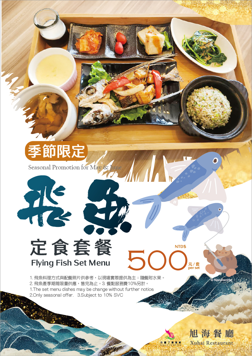 1. 飛魚料理方式與配餐照片供參考,以現場實際提供為主;隨餐附水果。